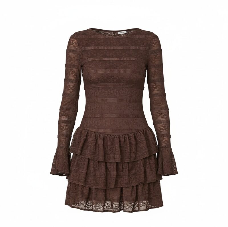 MIKRO-SPECYFIKACJA (UX BULLETS)Skład: 50% poliester, 45% nylon, 5% elastan • Fason: dopasowany w górnej części, falbaniasty dół • Elastyczność: elastyczna dzianina • Długość: przed kolano • Rękaw / dekolt: długi rękaw, okrągły dekolt SZYBKIE KORZYŚCI (UX FAST SCAN) ✔ podkreśla talię ✔ elastyczna i wygodna ✔ kobiecy dół z falbanami