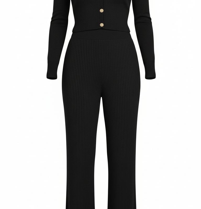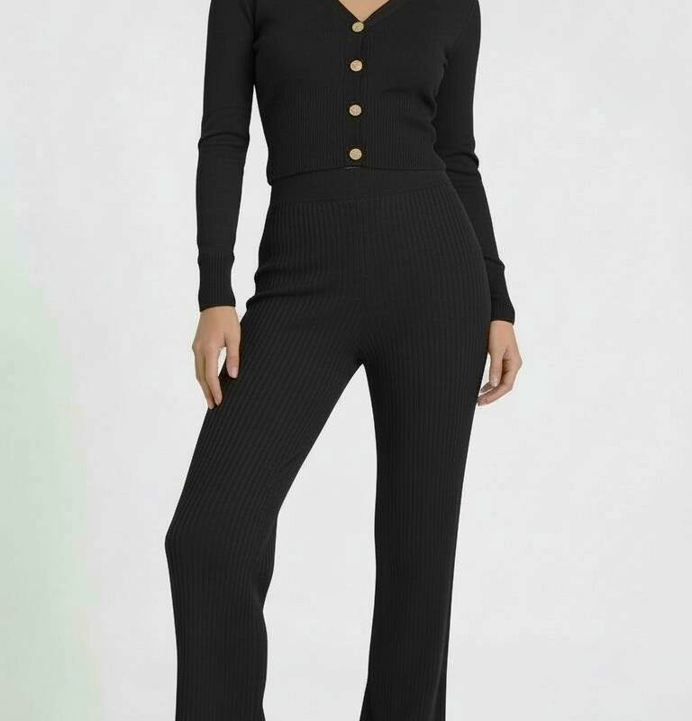 • Detale: prążkowana dzianina, dekolt V, guziki, rozszerzana nogawka