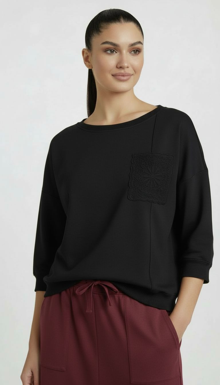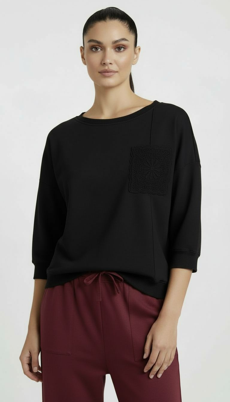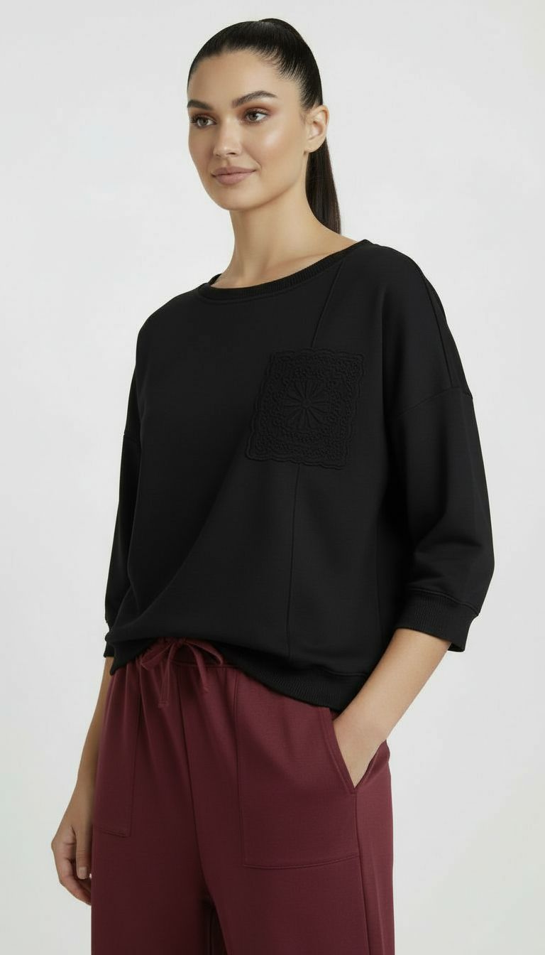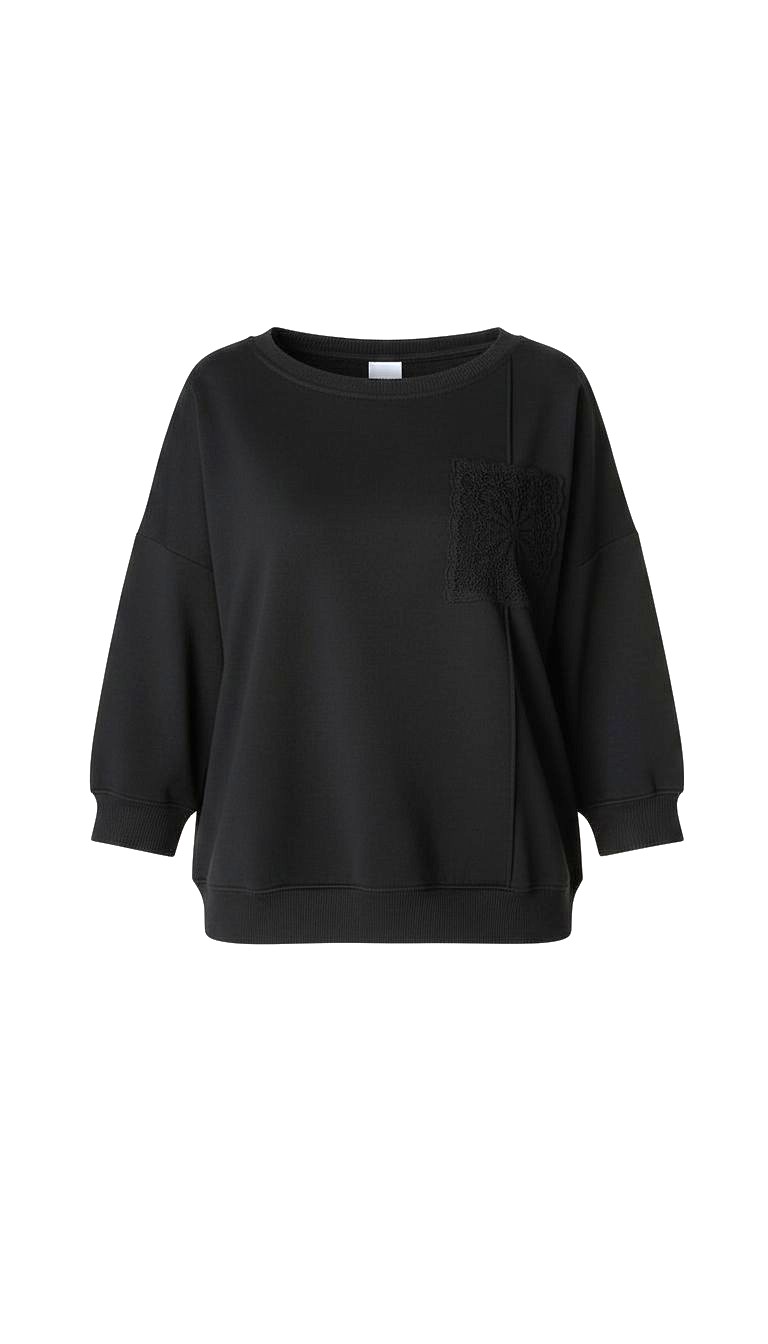 Czarna, wygodna bluza z kobiecym detalem, która łączy uniwersalność koloru z subtelną elegancją.
