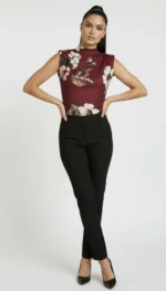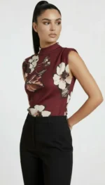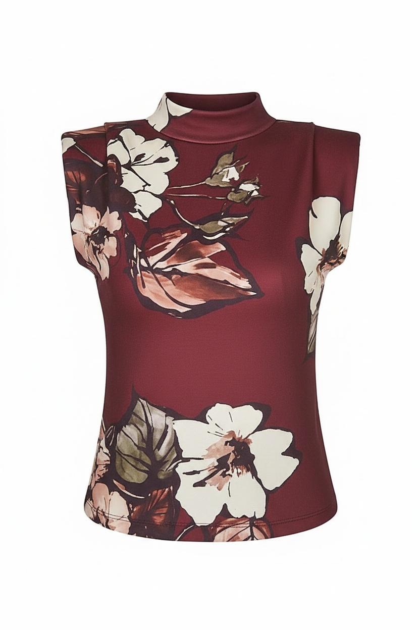 Elegancka bluzka bez rękawów w odcieniu głębokiego bordo, ozdobiona wyrazistym kwiatowym nadrukiem. Model z półgolfem subtelnie podkreśla szyję, a dopasowany krój pięknie akcentuje sylwetkę. To propozycja, która łączy kobiecość z nowoczesną elegancją — idealna zarówno do pracy, jak i na wieczorne wyjścia.