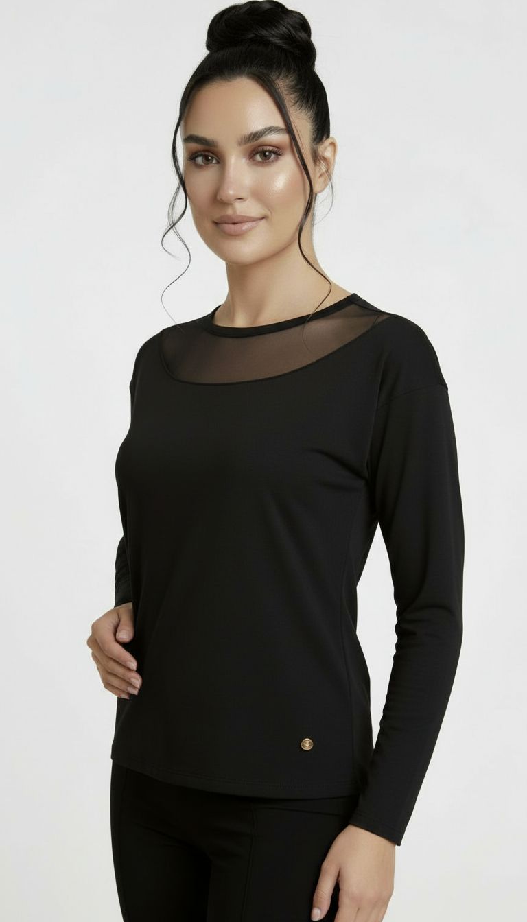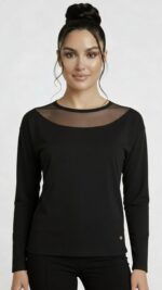Bluzka z długim rękawem i delikatnie transparentnym dekoltem, który nadaje całości lekkości. Dopasowany fason ładnie układa się na sylwetce, a elastyczny materiał zapewnia komfort noszenia. To model, który sprawdzi się zarówno na co dzień, jak i w bardziej eleganckich stylizacjach.