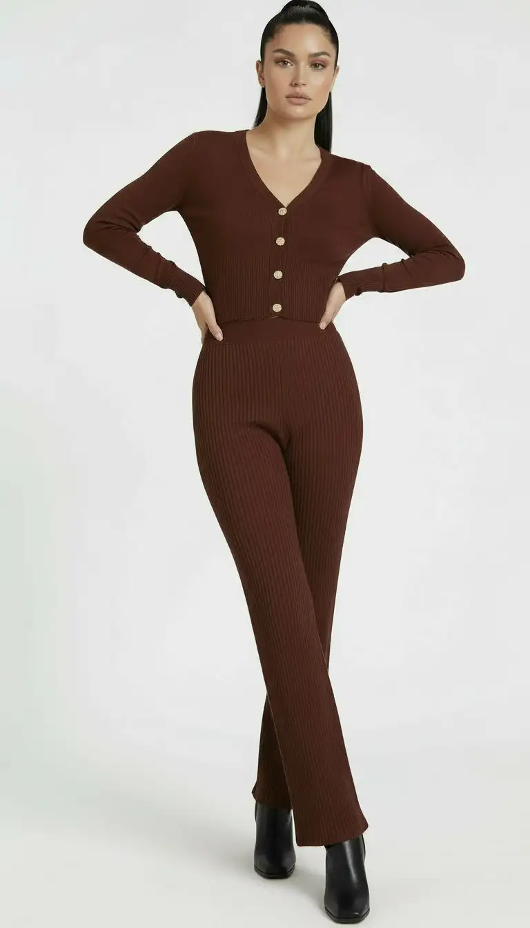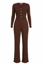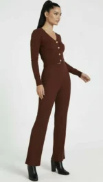 Elegancki, dzianinowy kombinezon w odcieniu głębokiego brązu, który łączy wygodę z kobiecą formą.