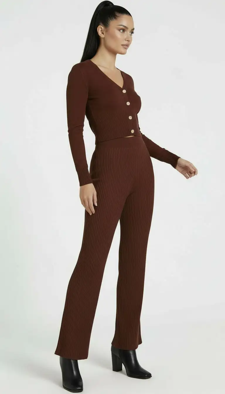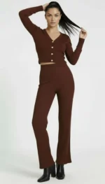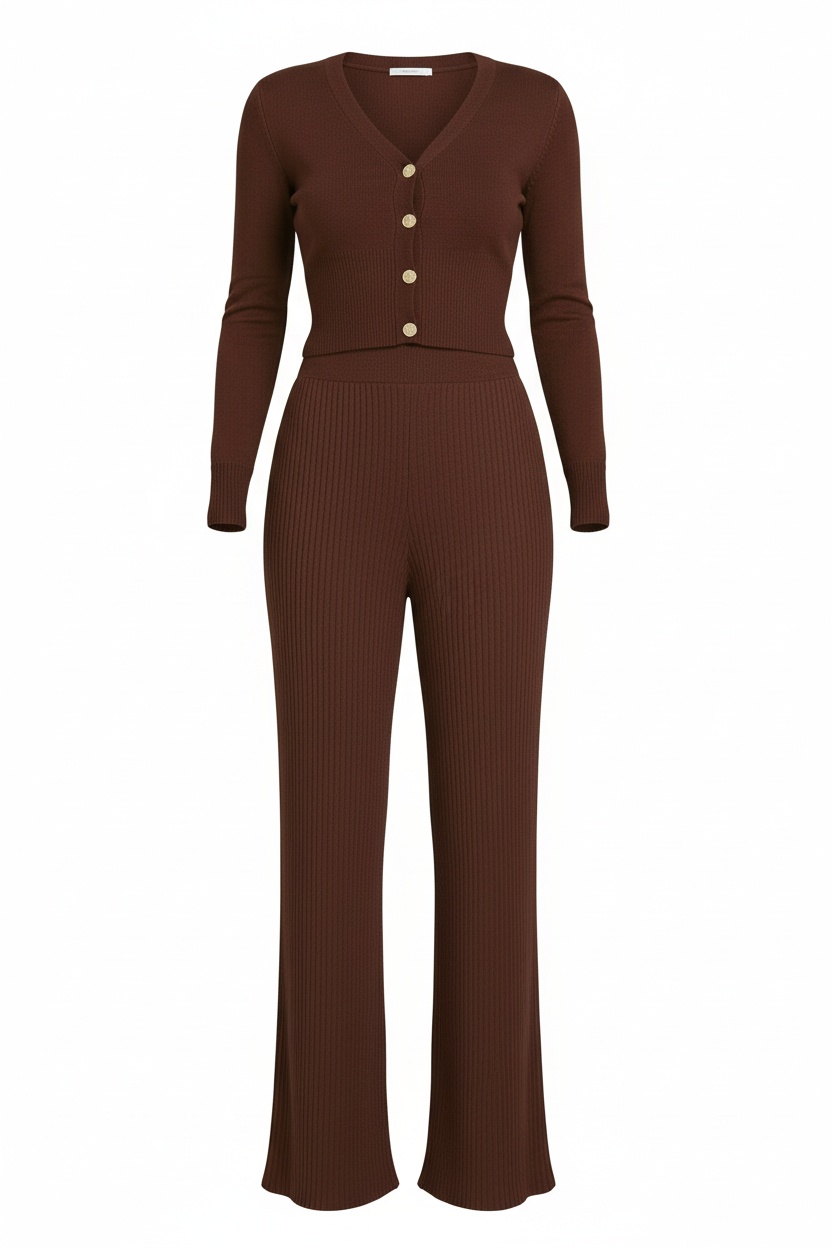 - detale: prążkowana dzianina, guziki, dekolt V, długi rękaw, rozszerzana nogawka