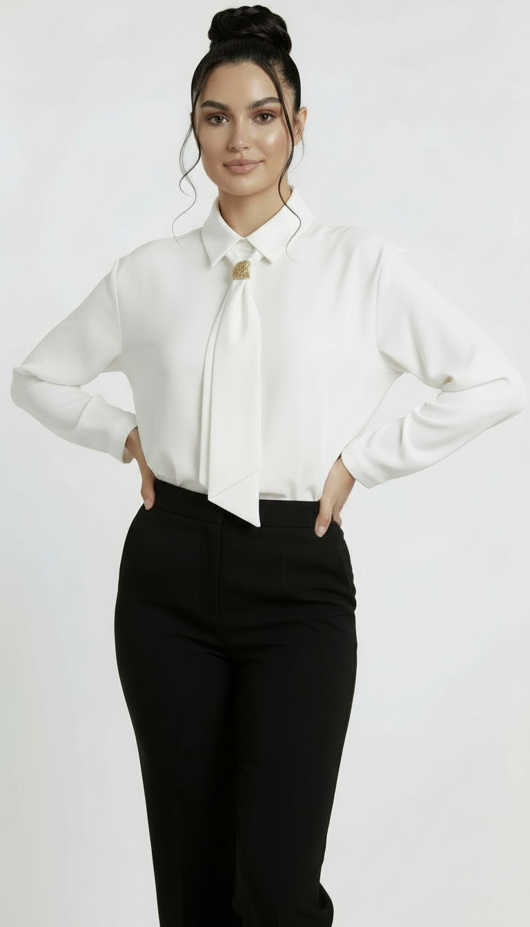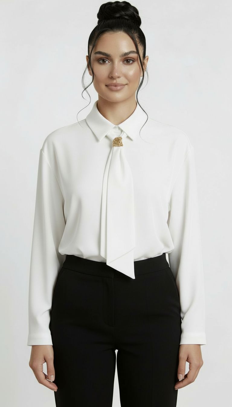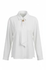 Model wykonany z gładkiej, lekkiej tkaniny, która miękko układa się na sylwetce i zapewnia komfort noszenia. Klasyczny kołnierzyk nadaje całości biznesowego charakteru, a ozdobne wiązanie pod szyją, wykończone subtelnym, biżuteryjnym elementem w złotym kolorze, przyciąga uwagę i stanowi elegancki akcent.