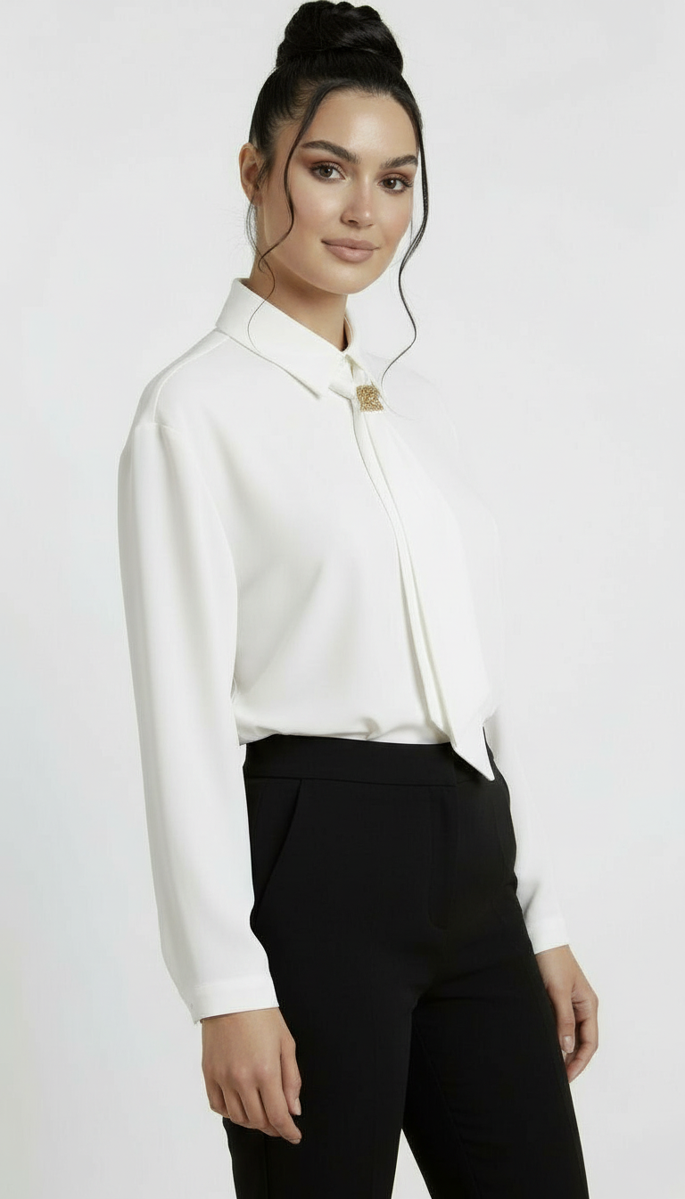 Klasyczna biała bluzka z eleganckim akcentem, idealna do stylizacji formalnych i biznesowych. Bluzka wykonana z gładkiej tkaniny poliestrowej o niskiej