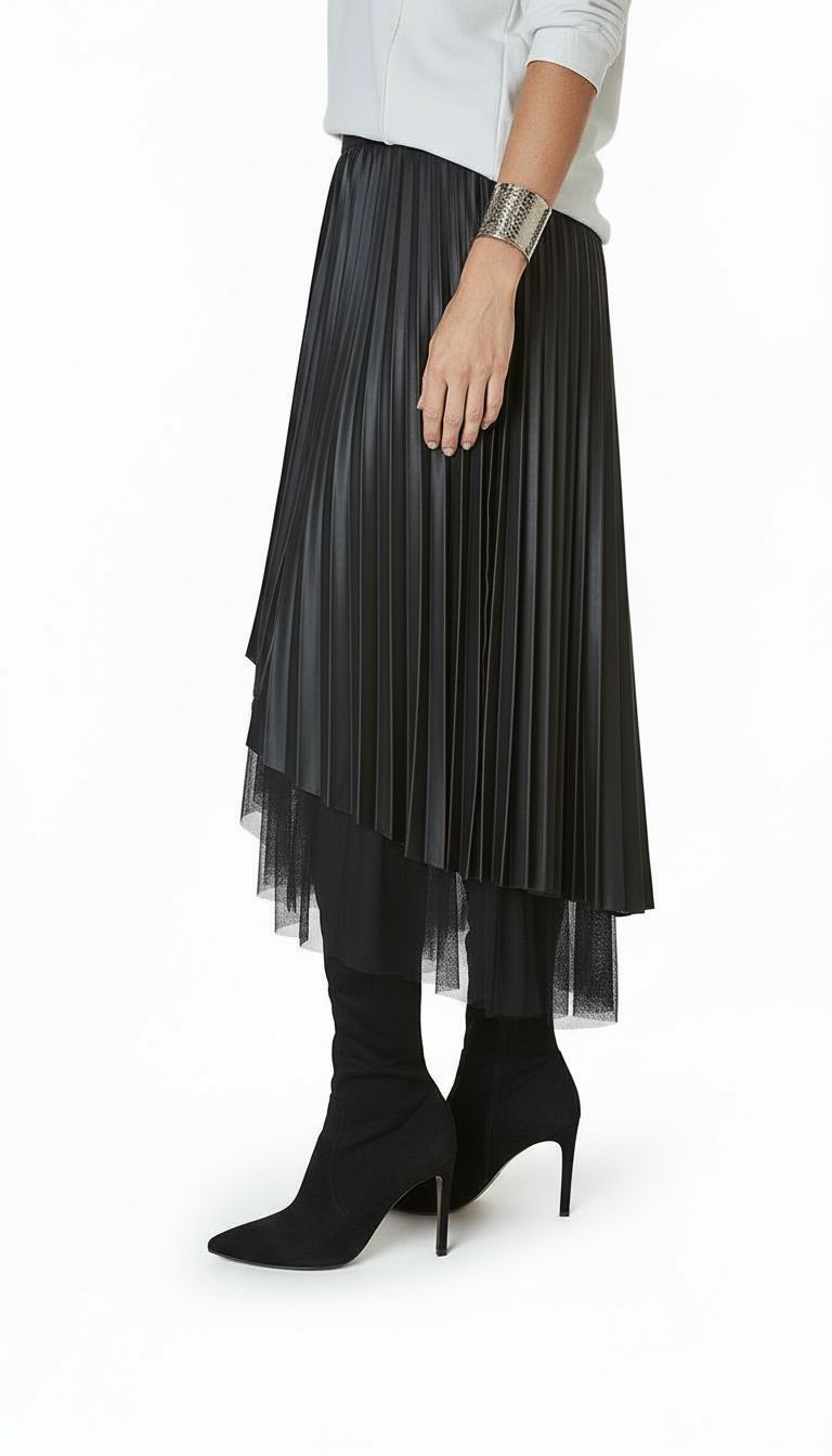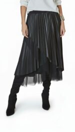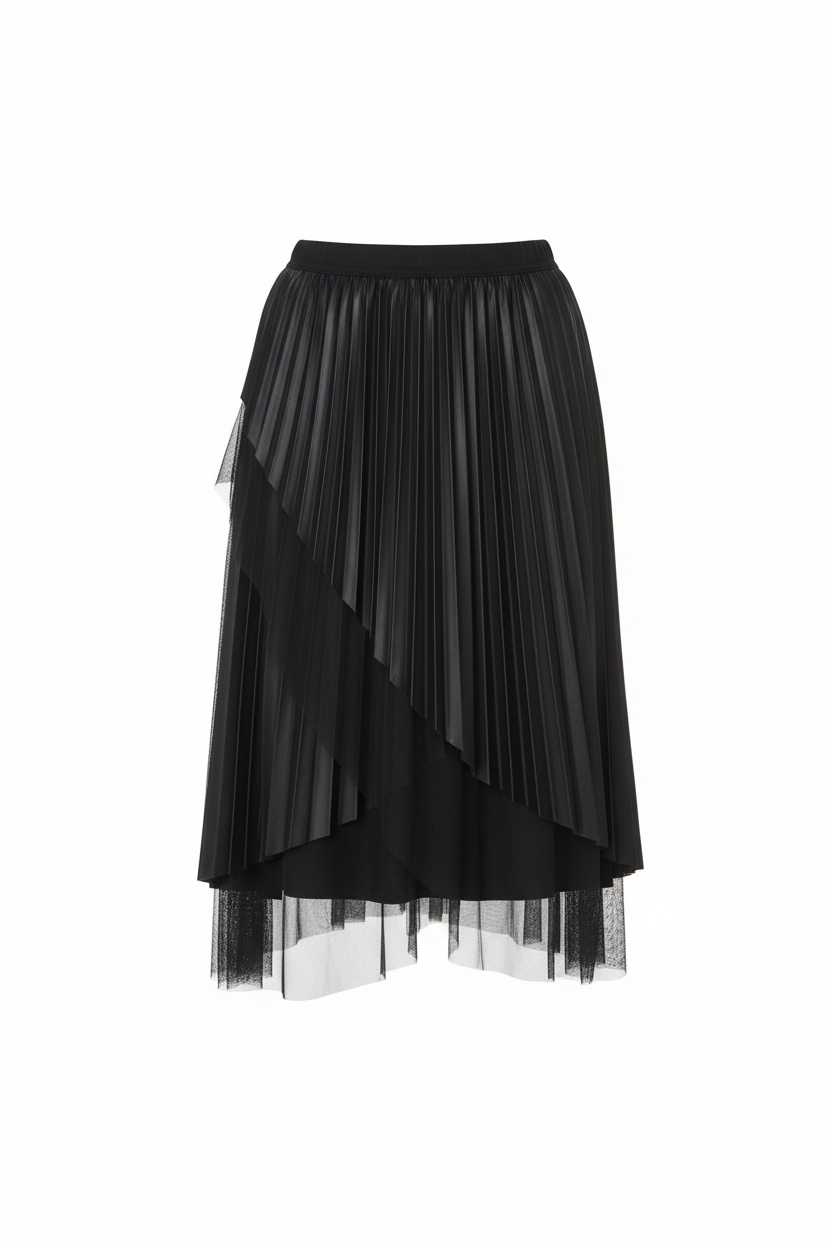 Model wykonany z połączenia gładkiej tkaniny oraz transparentnego tiulu, co tworzy efekt warstwowości i nadaje stylizacji głębi. Plisowania pięknie pracują w ruchu, a asymetryczne wykończenie dodaje całości nowoczesnego, kobiecego charakteru. Elastyczna talia zapewnia wygodę noszenia i dobre dopasowanie.