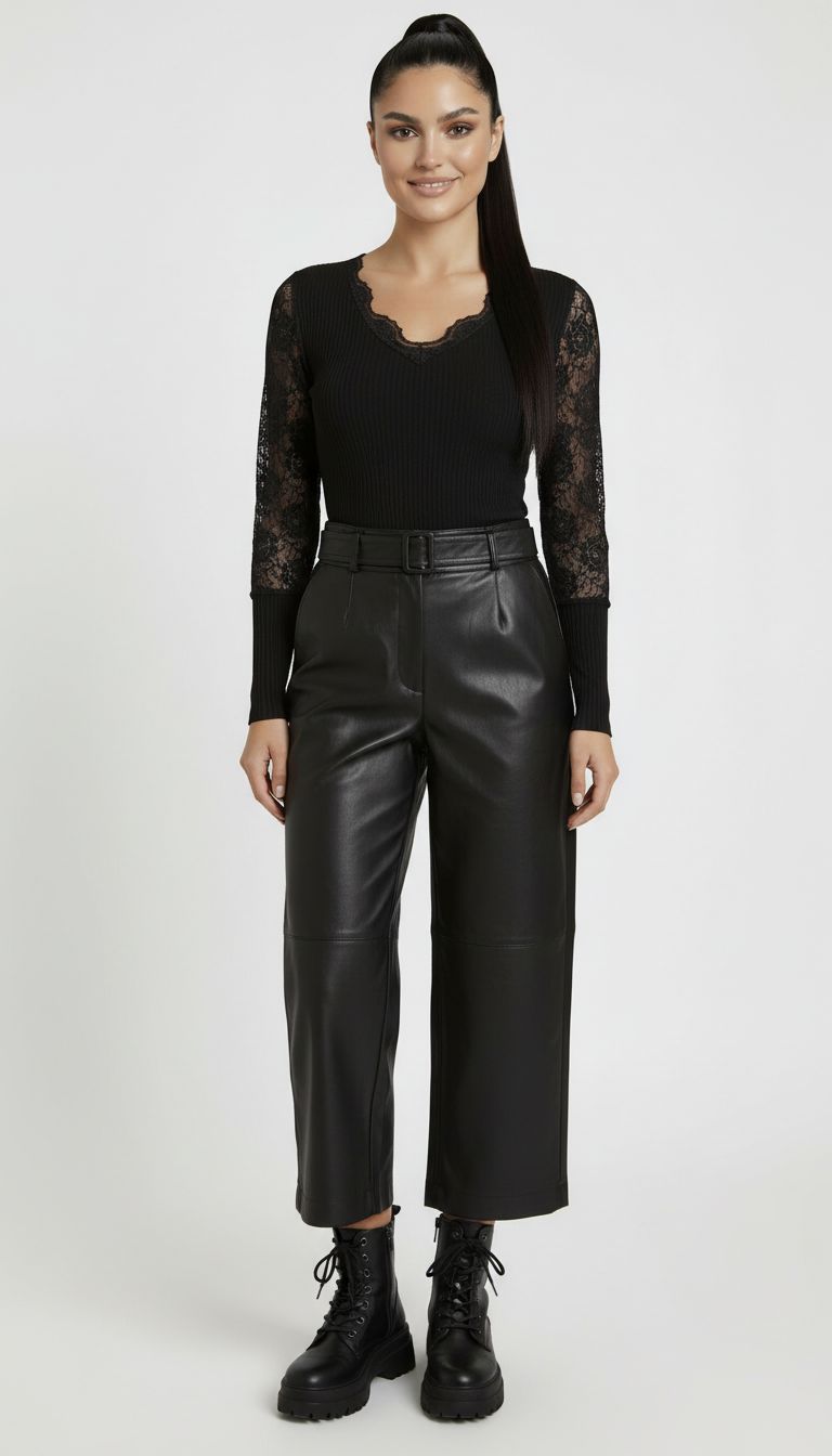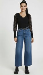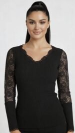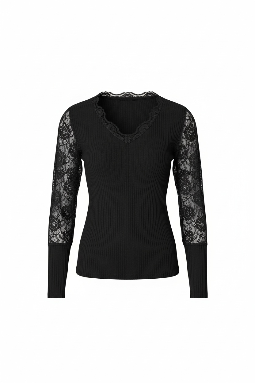 Czarna bluzka z prążkowanej dzianiny z delikatnymi, koronkowymi rękawami, która łączy codzienny komfort z eleganckim wykończeniem.