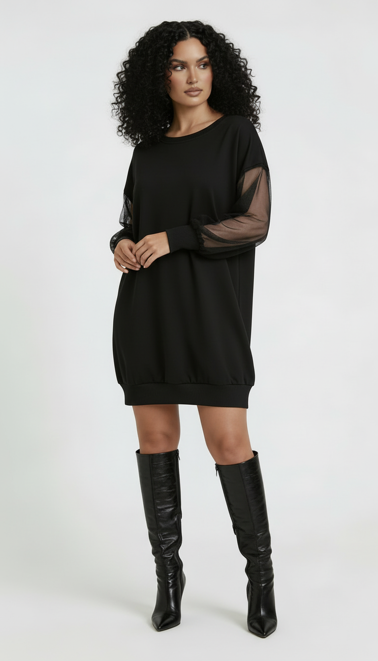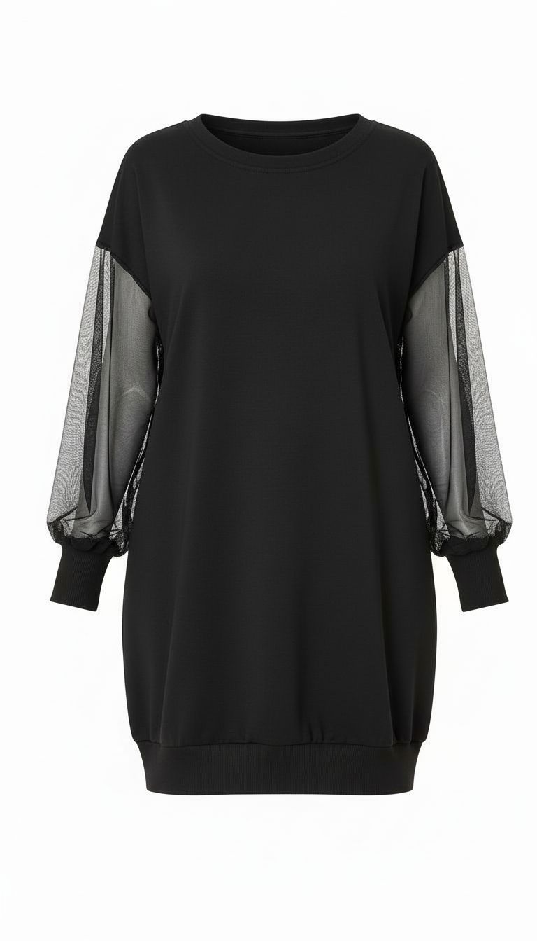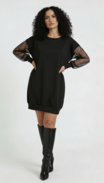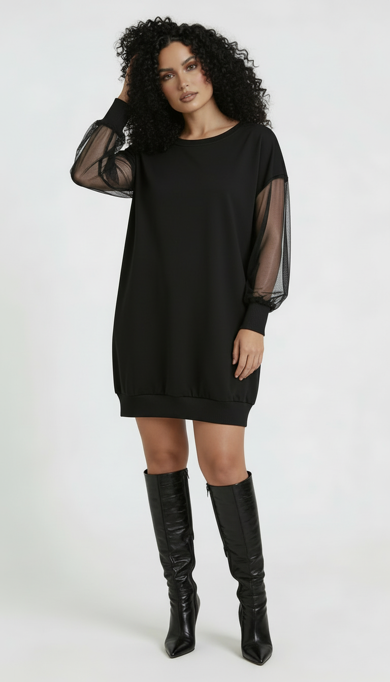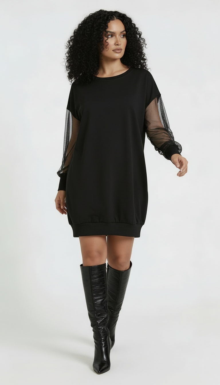 Czarna sukienka tunikowa o nowoczesnym charakterze, łącząca komfort dzianiny z lekką elegancją transparentnych rękawów.