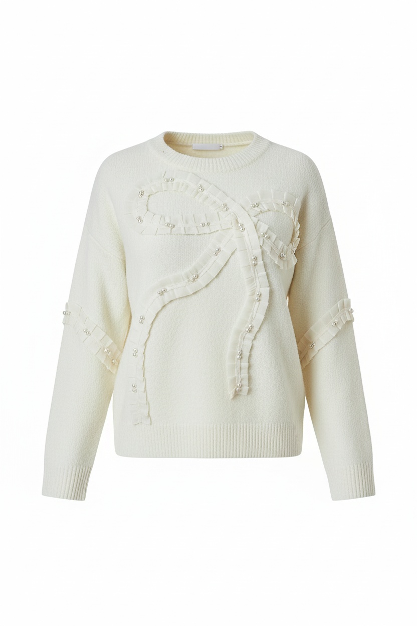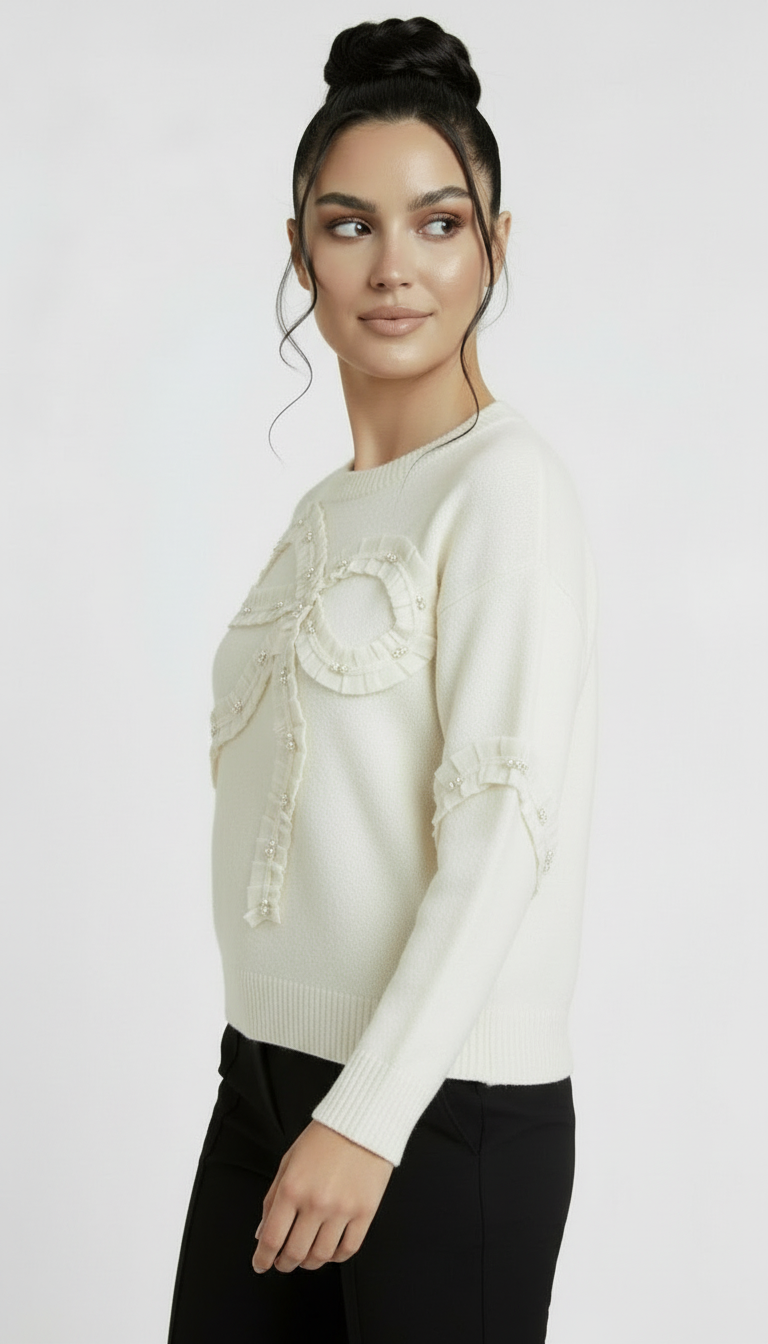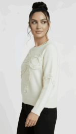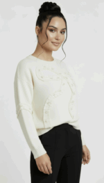 To sweter, który zakładasz, gdy chcesz wyglądać elegancko, ale bez przesadnej formalności. Subtelne zdobienia dodają charakteru, a jasna biel pięknie komponuje się z klasycznymi spodniami lub spódnicą. Idealny na co dzień i na bardziej wyjątkowe okazje.