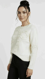 Elegancki, jasny sweter, który łączy komfort miękkiej dzianiny z biżuteryjnym detalem.